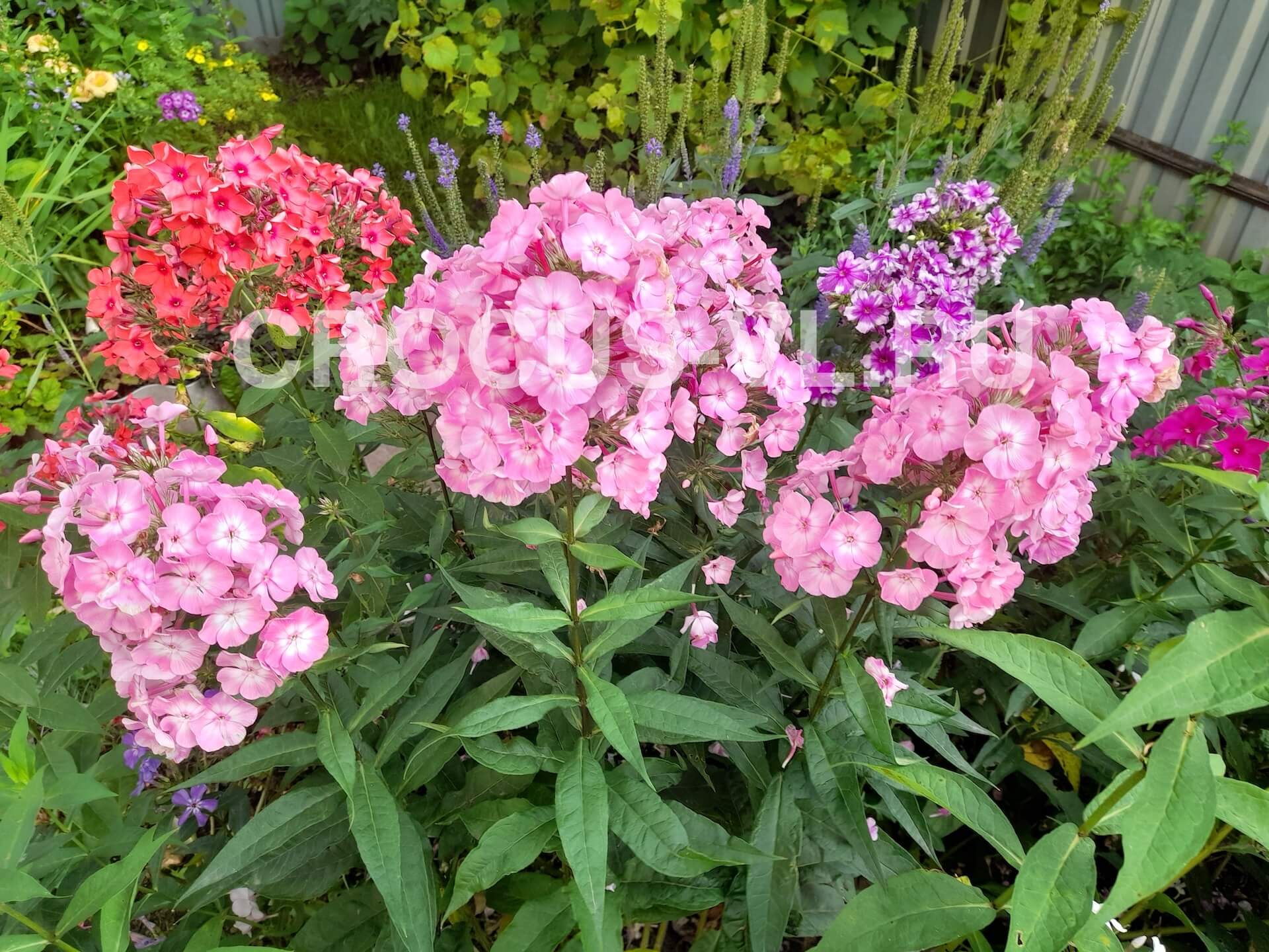Флокс метельчатый (Phlox paniculata) «Cvetuschaya Sakura» – многолетнее корневищное, травянистое растение, высотой до 70-80 см. Относится к семейству Синюховые (Polemoniaceae). Цветки крупные, до 3 см. в диаметре, колесовидные, бледно-розовые с большим белым центром и тёмно-розовой трубкой. Лепестки слегка волнистые. Соцветие крупное, размером 17х20 см., плотное, овально-конической формы, с нежным ароматом. Листья темно-зеленые, ланцетовидно-овальной формы со слегка зазубренным краем, расположены супротивно на крепких стеблях. Куст компактный, диаметром кроны до 50-60 см., с прямостоячими стройными цветоносами.