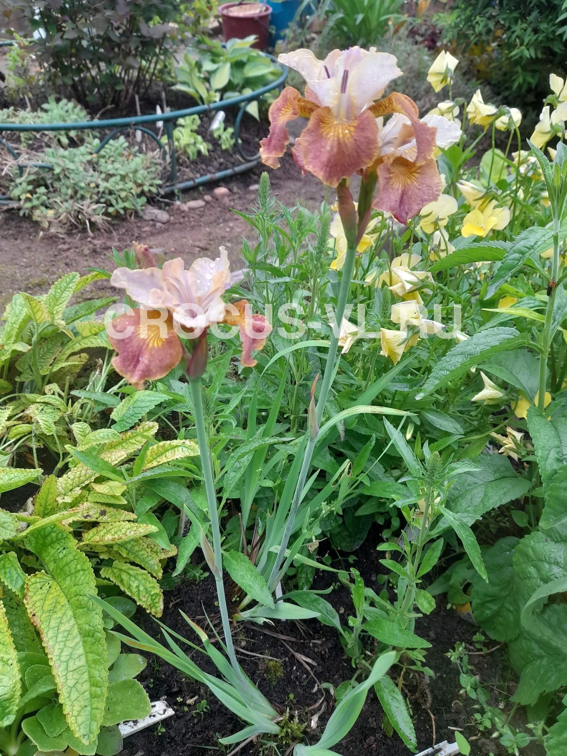 Ирис сибирский (Iris siberica) «Флайинг Фиддлз» («Полет без Скрипки») – многолетнее корневищное, травянистое растение, высотой до 40-50 см. Относится к семейству Ирисовые или Касатиковые (Iridáceae). Цветки крупные, диаметром до 10 см., нижние лепестки (фолы) слегка гофрированные, коричневатые с большими желтыми сигналами, украшенными бронзовой сеточкой, верхние (стандарты) – кремового и голубоватого оттенка. Листья зеленые, узкие длинные, линейно-заостренной формы. Образует компактный куст, диаметром до 30-40 см., с прямостоячими цветоносами, на концах которых образуется по 2-3 цветка.
