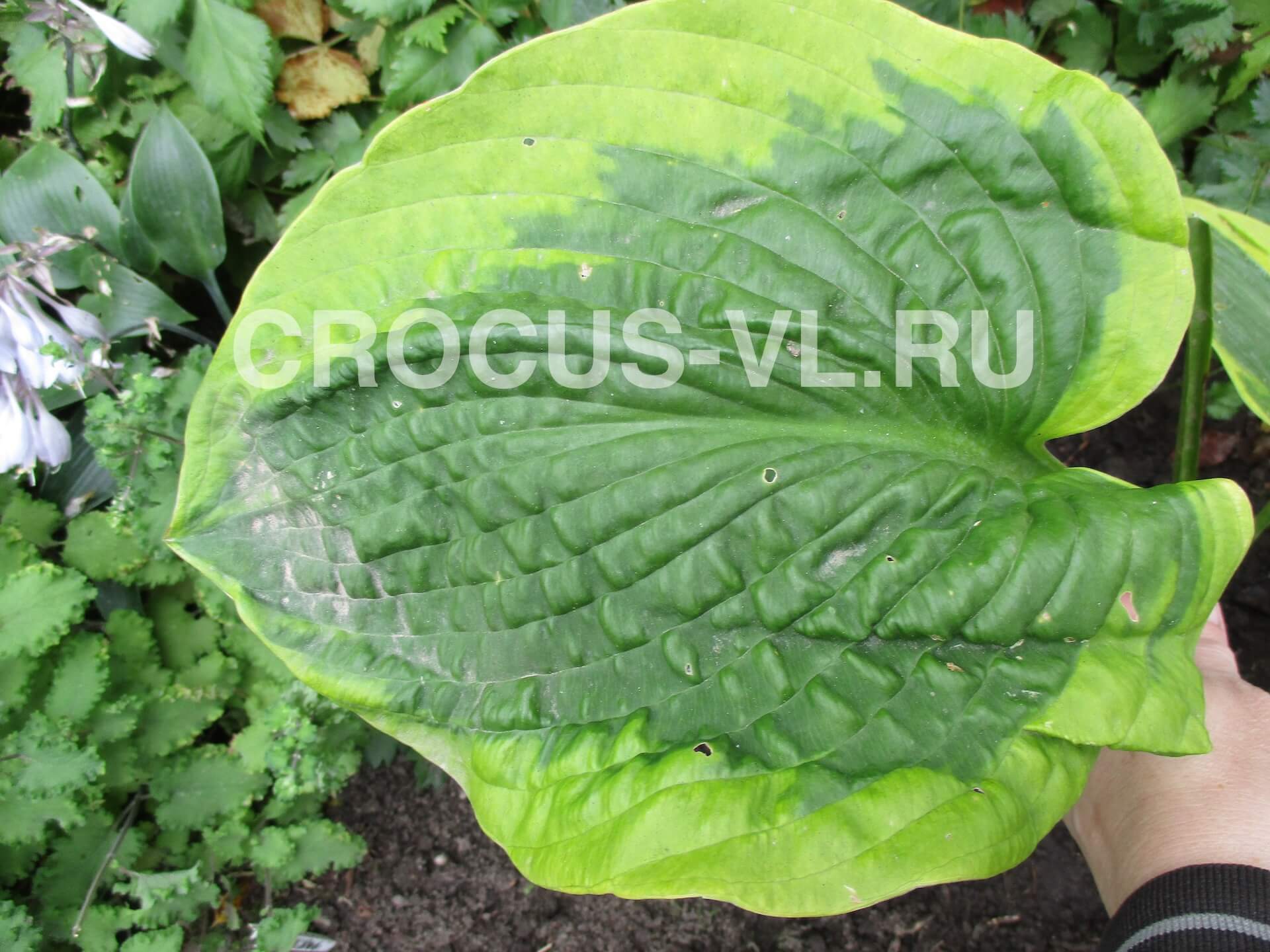 Хоста гибридная (Hosta hybride) «Samurai» – многолетнее корневищное, травянистое растение, высотой 50-60 см. Относится к семейству Спаржевые (Asparagaceae). Листья крупные, сердцевидные, темно-зеленые с синеватым, восковым блеском, отороченные широким, неравномерным, желтовато-салатовым кантом. Листовая пластина жатая, размером 15х18 см., с выраженным жилкованием, немного волнистая по краю. Окраска и форма листьев в полной мере проявляются со второго-третьего года посадки. Цветки крупные колокольчатые, с легким ароматом, бледно-лавандового цвета, размером до 4-5 см., на концах высоких цветоносов. Куст мощный, раскидистый, крупного (L) размера, диаметром до 70-80 см.