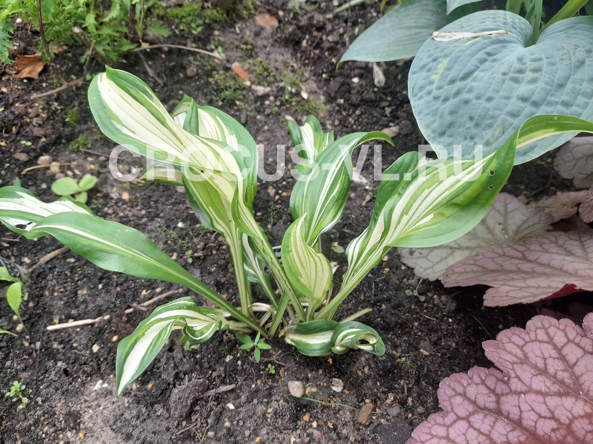 Хоста гибридная (Hosta hybride) «Твистед Сперминт» («Витая Мятная») – многолетнее корневищное, травянистое растение, высотой всего 35-40 см. Относится к семейству Спаржевые (Asparagaceae). Листья узкие, длинные, белые с зеленым нерегулярным кантом и отходящими от него оливковыми всполохами и штрихами. Листовая пластинка перекрученная, волнистая по краю, на длинных, бело-зеленых черешках. Окраска и форма листьев в полной мере проявляются со второго-третьего года посадки. Цветки колокольчатые, с легким ароматом, лавандового цвета, размером до 3 см., на концах цветоносов. Куст раскидистый, среднего (M) размера, диаметром до 50-60 см.