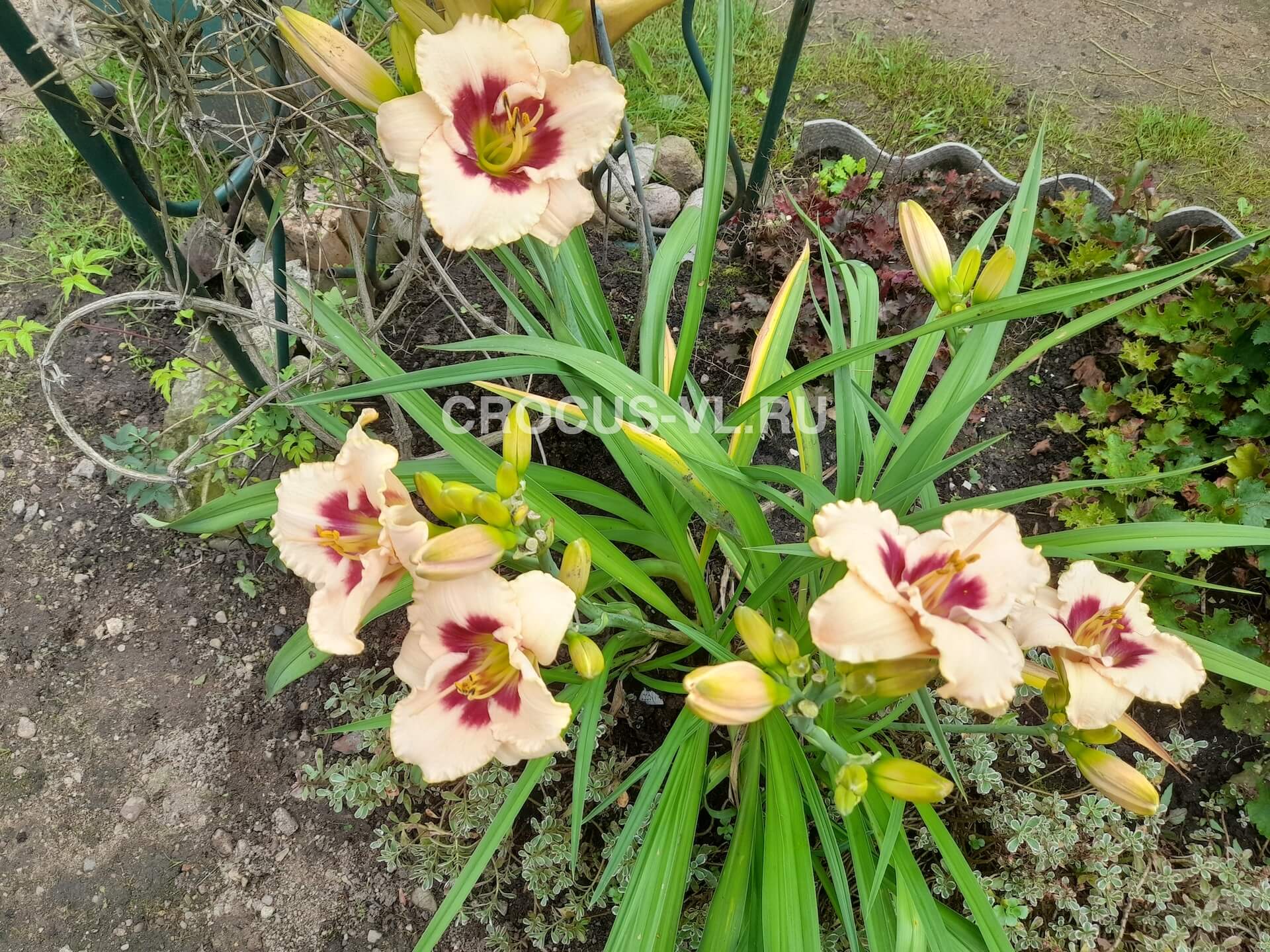 Лилейник (Hemerocallis) «Канадиан Бордер Патрол» – многолетнее корневищное, травянистое растение высотой до 60-70 см. Относится к семейству Асфоделовые. Цветок крупный, диаметром до 12-13 см., бежево-кремового цвета с большим винно-красным центром и тонким, красновато-желтым, гофрированным кантом. Горло желтовато-зеленое. Лепестки широкие. Изящная листва зеленого цвета, ремневидной формы. Куст мощный, прямостоячий, диаметром до 40-50 см. Полувечнозеленый, тетраплоид.