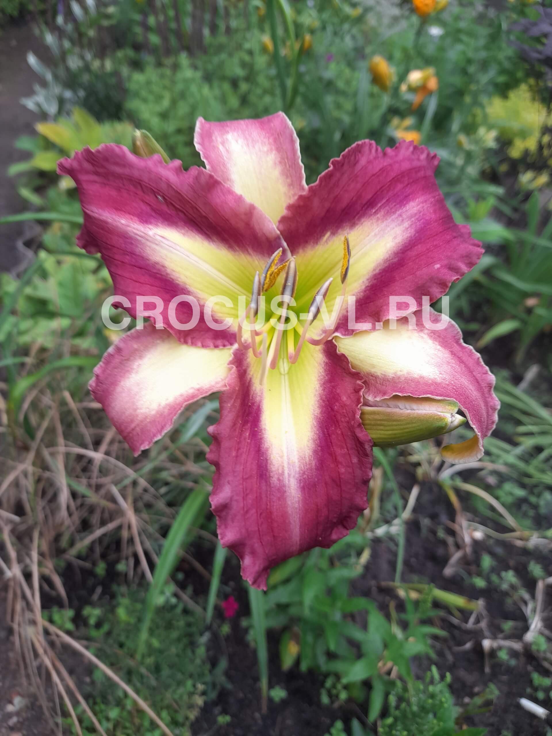 Лилейник (Hemerocallis) «Тайм Стоппер» («Время Остановилось») – многолетнее корневищное, травянистое растение, высотой до 70-80 см. Относится к семейству Асфоделовые (Asphodelaceae). Цветок очень крупный, диаметром до 18 см, темно-бордовый с огромным желто-зеленым горлом в бордово-фиолетовой окантовке по краям очерченной пурпурной нитью. Край лепестков волнистый. Листья узкие ремневидные, тёмно-зелёные, собраны в прикорневую розетку. Образует компактный куст, диаметром до 40-50 см., с прямостоячими ветвистыми, крепкими цветоносами, на концах которых может образовываться до 18 бутонов. Спящий диплоид.