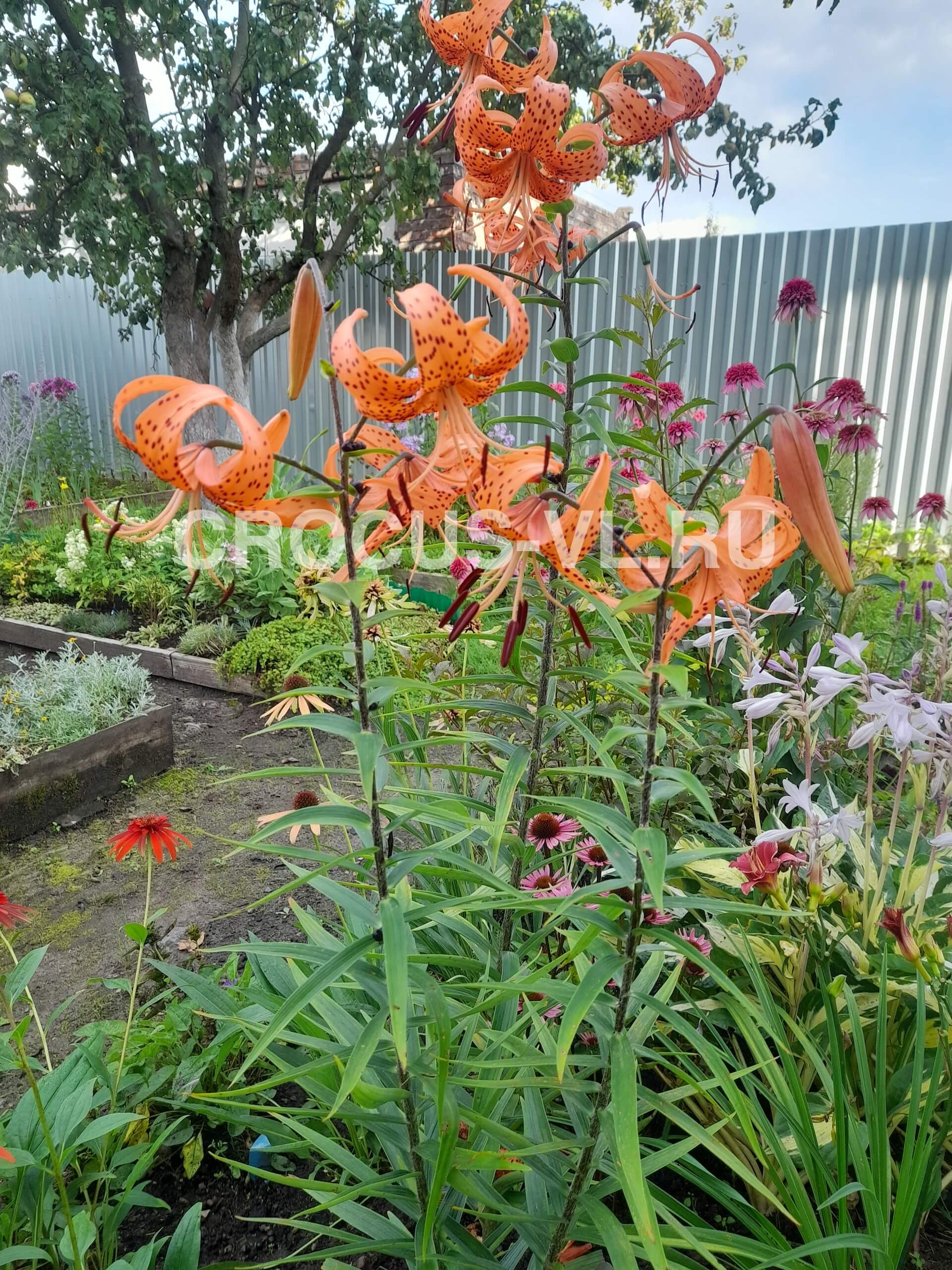 Лилия тигровая (Lilium Tigrinum) «Спленденс» («Великолепная») – многолетнее луковичное, травянистое растение, высотой до 90-100 см. Относится к семейству Лилейные (Liliaceae). Цветки чалмовидные, среднего размера диаметром до 9-10 см., ярко-оранжевого цвета обильно покрыты крупным бордовым крапом. Пыльники коричневатого оттенка. Лепестки круто загнуты на внешнюю сторону. Соцветия шестилепестковые, направленные вниз, с легким ароматом. Прочные стебли сплошь покрыты узкими, блестящими листиками темно-зеленого цвета. Луковица крупная, диаметром до 5-6 см. Образует компактную куртину, диаметром до 30-40 см., с прямостоячими коричневатыми цветоносами, на концах которых распускается до 20 цветков.