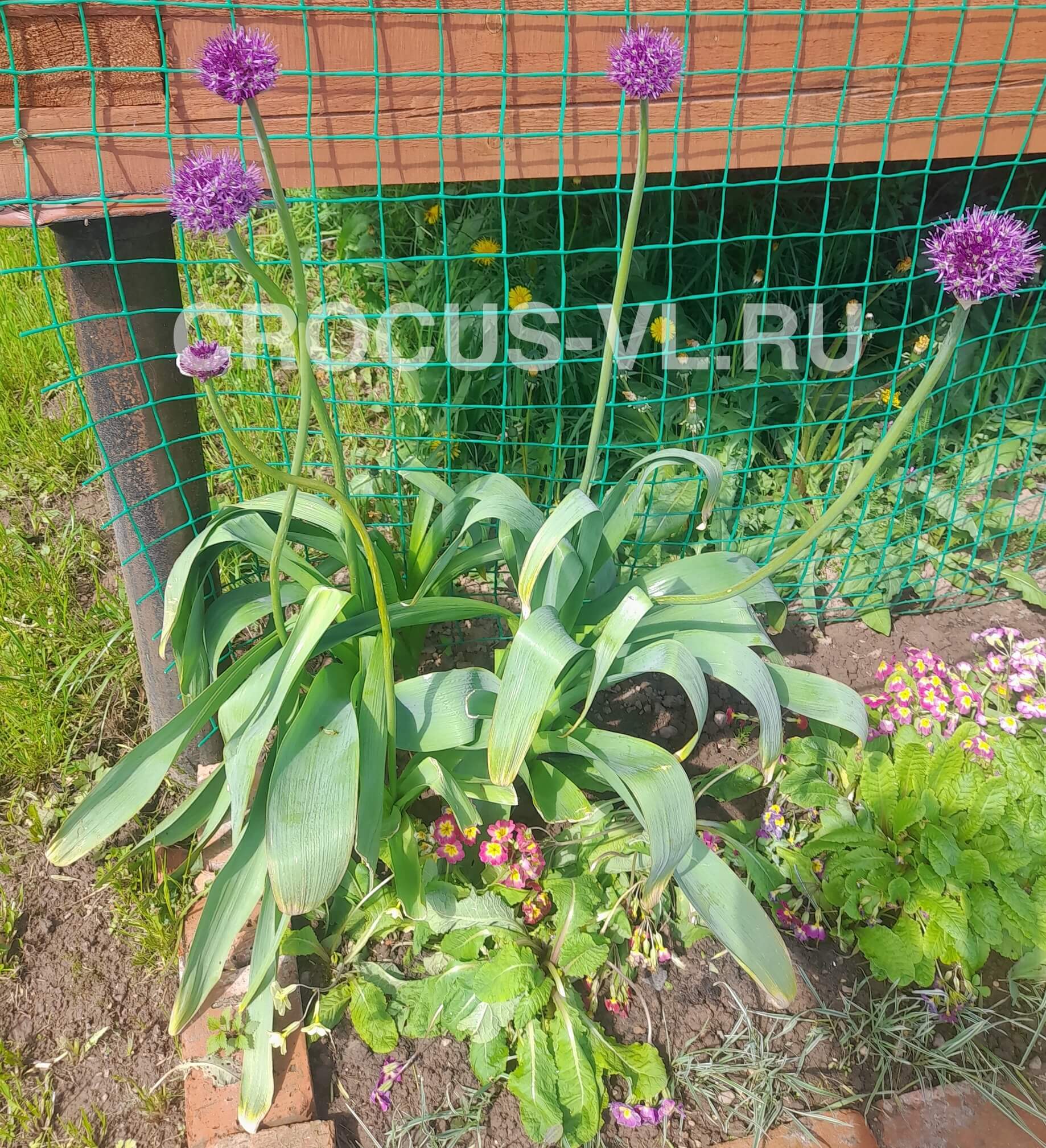 Аллиум или лук-анзур Суворова (Allium suworowii) — многолетнее луковичное, травянистое растение, высотой до 80-100 см. Относится к семейству Амариллисовые (Amaryllidáceae). Цветки махровые фиолетовые, собраны в крупное, шаровидное соцветие, диаметром до 8-10 см., на концах прочных прямостоячих цветоносов. Листва широкая ремневидная, сизовато-зеленая, длиной 30-35 см., собрана в мощную прикорневую розетку, диаметром до 50-60 см. Образует крупную луковицу, диаметром до 4-6 см. Цветет в средние сроки, с конца мая по июнь. В июле листва отмирает полностью. Предпочитает солнечные места. Любит песчануую или суглинистую, хорошо дренированную почву. Медонос. Нарастает умеренно. Размножается делением гнезд луковиц, раз в 3-4 года, или семенами. Высаживается в сентябре-октябре, на глубину 5-10 см., с расстоянием между луковицами 20 см. Зимостоек. Используется в миксбордерах, различных цветниках, на рабатках и клумбах. Сочетается в компании с тюльпанами, ирисами, арабисами. Легендарный лук-анзур, сочетающий в себе великую мощь и красоту!