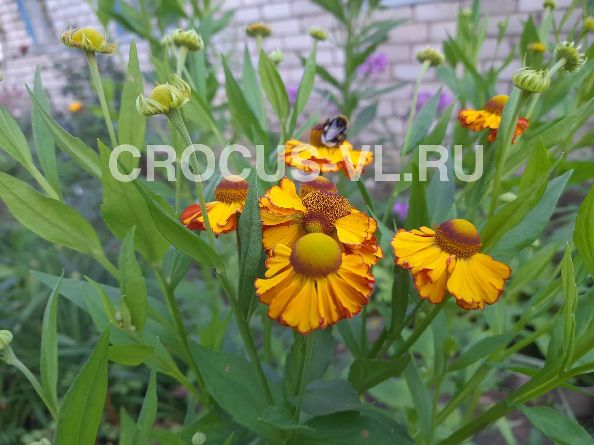 Гелениум осенний (Helenium autumnale) «Зимбельштерн» – многолетнее корневищное, травянистое растение, высотой до 90-100 см. Относится к семейству Астровые (Compositae) Цветки крупные, диаметром до 5 см., яркого желтого цвета сверху, коричневато-красные снизу и таким же тонким кантиком по краю слегка приподнятых гофрированных лепестков. Трубчатая выпуклая серединка коричневато-охровая. Листья ярко-зеленые, ланцетовидные, с зубчатым краем. Образует прямостоячий куст с ветвистыми побегами, диаметром до 40-50 см.