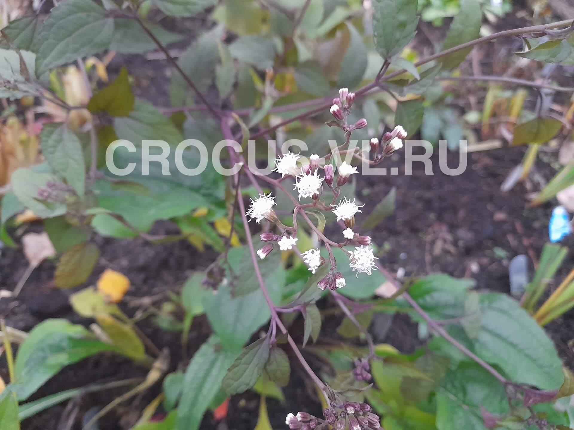 Посконник морщинистый (Eutrochium rugosum) «Чоколэйт» («Шоколад») – многолетнее корневищное, травянистое растение, высотой до 90-100 см. Относится к семейству Астровые (Asteraceae). Листья крупные, овально-заострённые, морщинистые, глянцевые, по краю зубчатые, при распускании почти чёрные, летом шоколадно-зелёные. Цветки мелкие, белые собраны в пушистые, щитковидные соцветия, диаметром до 10-15 см. Образует прямостоячий ветвистый куст, шириной до 60–80 см.