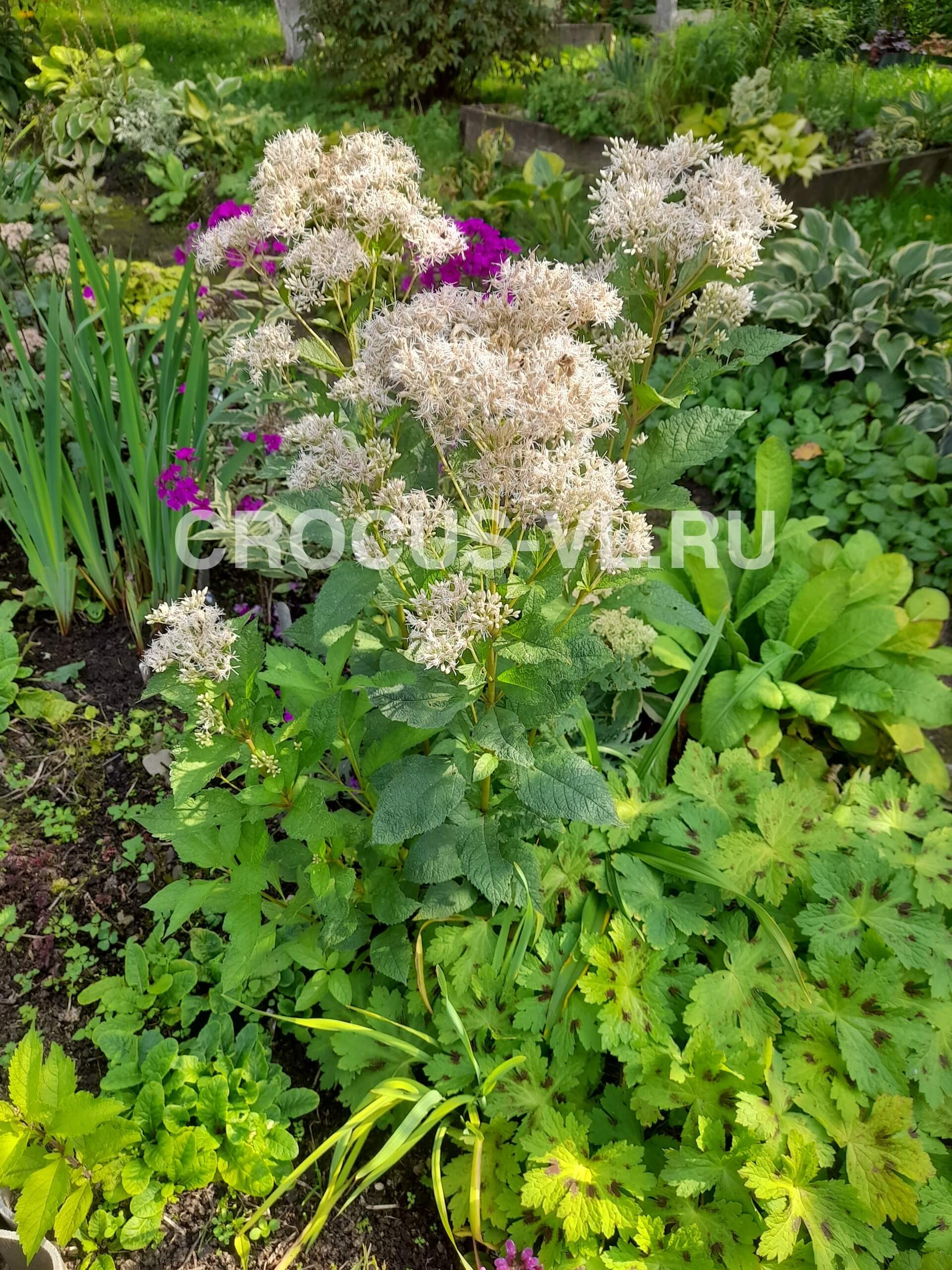 Посконник пятнистый (Eutrochium maculatum) «Сноуболл» («Снежок») – многолетнее корневищное, травянистое растение, высотой до 80-90 см. Относится к семейству Астровые (Asteraceae). Цветки мелкие, кремово-белые собраны в шаровидные соцветия, диаметром до 15-20 см. Листья светло-зеленые, мутовчато расположенные, по краю зубчатые, удлиненной формы, размером до 14 см. Образует прямостоячий компактный куст, шириной до 40-50 см., с устойчивыми к погодным условиям цветоносами.