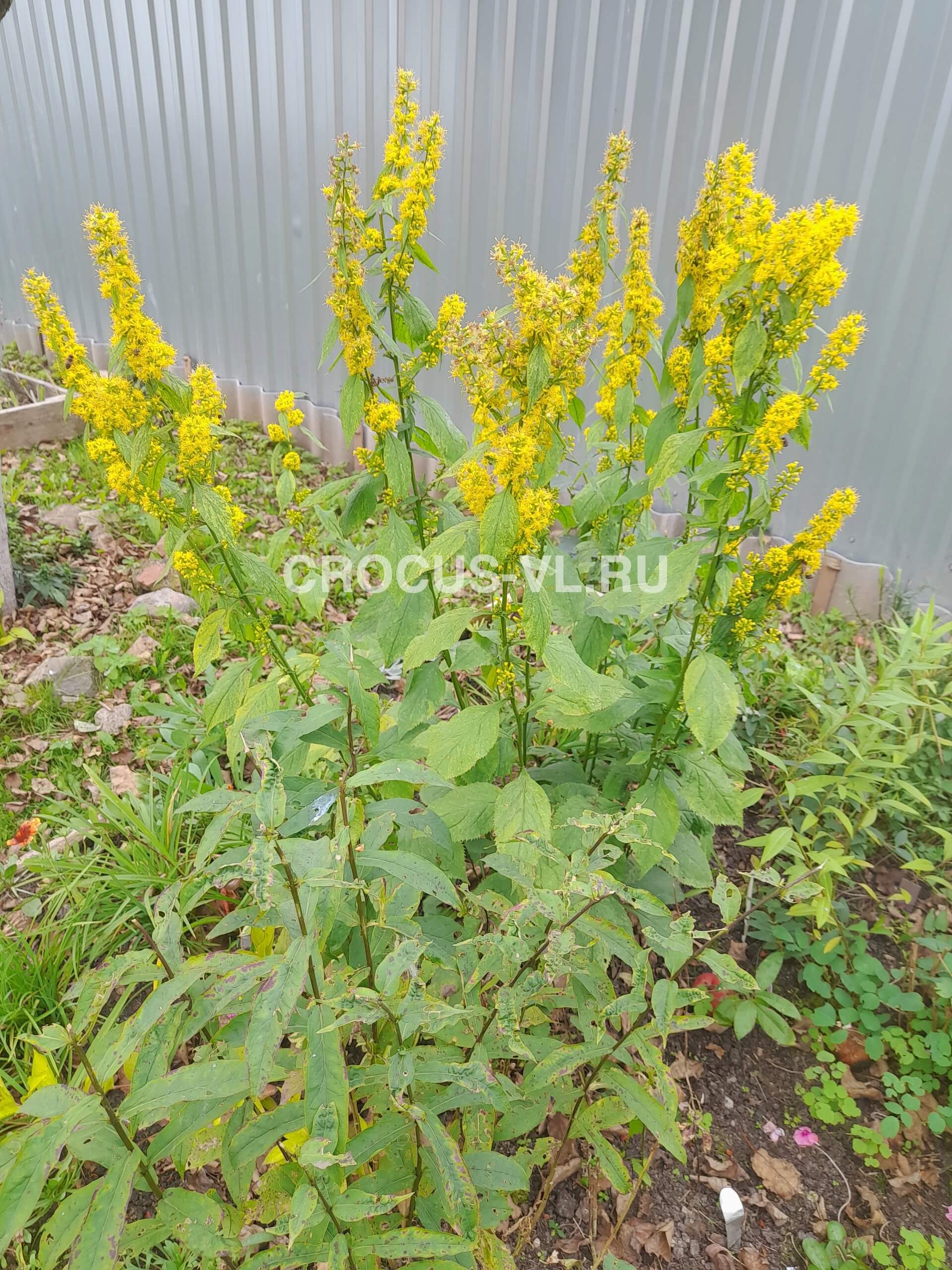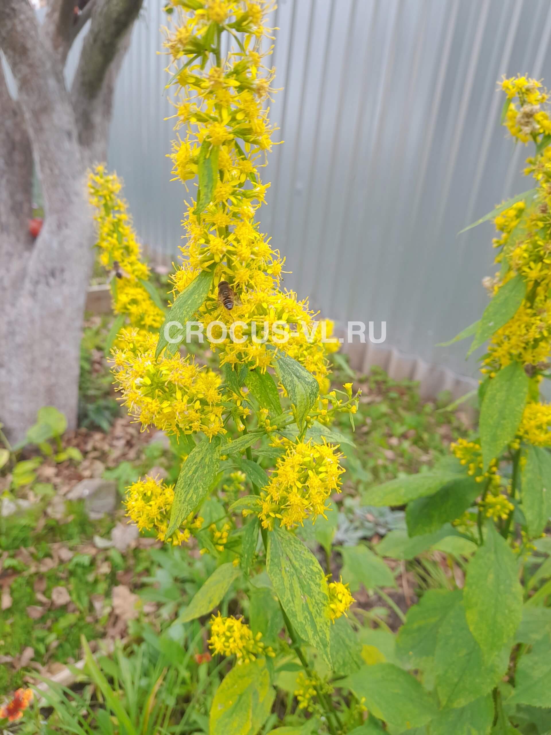 Солидаго (Solidago flexicaulis) или золотарник извилистостебельный «Вариегата» — многолетнее корневищное, травянистое растение, высотой до 50-60 см. Относится к семейству Астровые (Asteraceae). Листья овально-заостренные с зубчиками по краю, зеленые с желтовато-кремовыми штрихами и крапинками. Цветки ярко-желтые, пушистые, мелкие собраны в цилиндрические соцветия, длиной до 15 см. Образует компактный куст, диаметром до 40-50 см., с прямостоячими цветоносами.