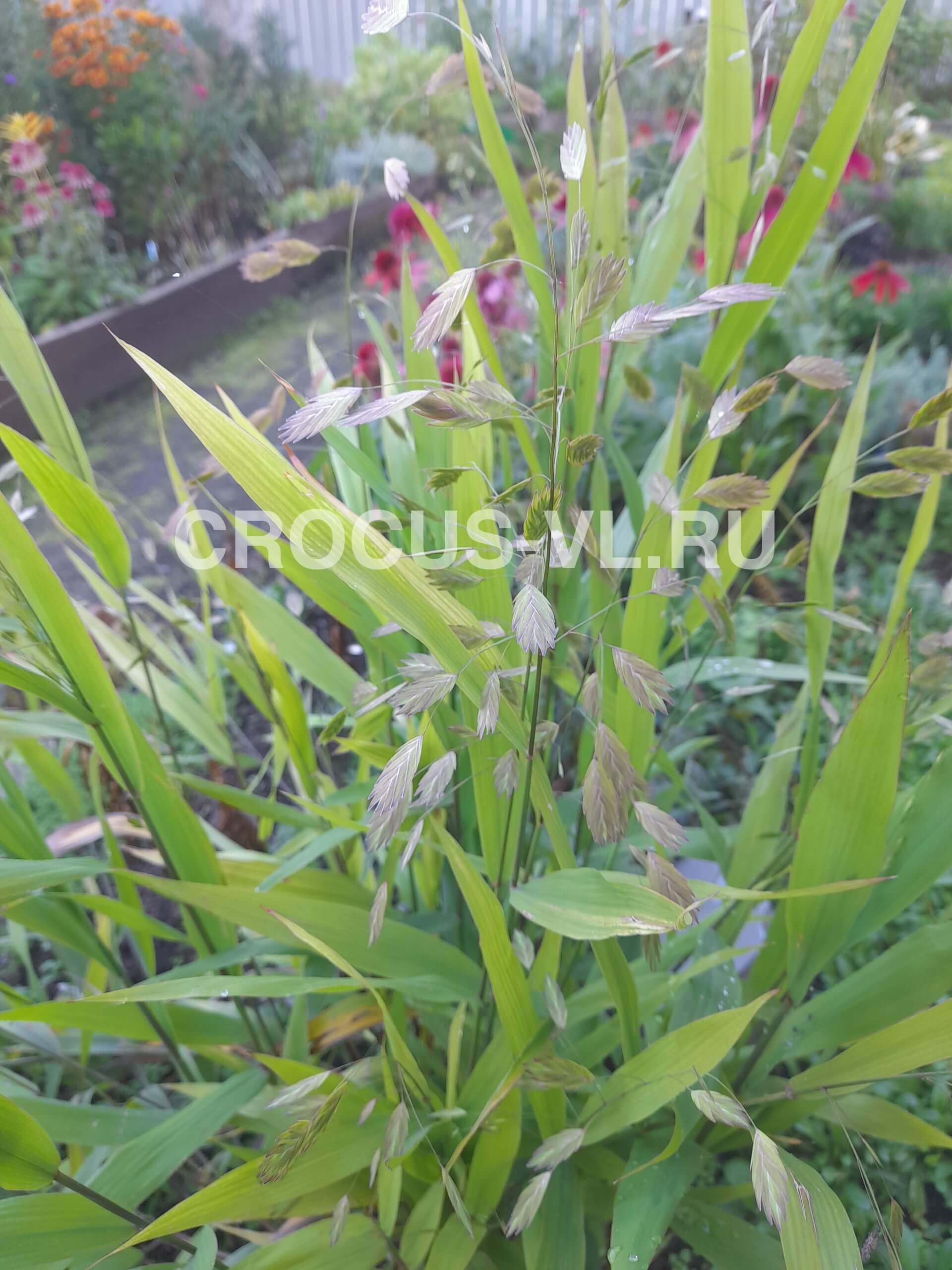 Хасмантиум, латифолиум широколистный (Chasmanthium latifolium) или плосколистник – многолетнее корневищное, травянистое злаковое растение, высотой до 70-80 см. Относится к семейству Злаковые (Poaceae). Листья плоские, линейные, длинные, длиной около 20 см., шириной до 2 см., сочно-зеленого цвета, сверху до низа густо покрывающие прочные стебли. С конца лета появляются ярко-желтые, лимонные, коричневатые, пурпурные оттенки. Цветки салатового цвета, плоские, почти овальной формы, размером до 3 см., расположены на концах тонких цветоносов и слегка свисают в стороны в виде "сережек". Ближе к осени соцветия, размером до 10-15 см., становятся золотистыми или красно-бурыми. Образует плотную компактную кочку с прямостоячими побегами, диаметром до 40-50 см.